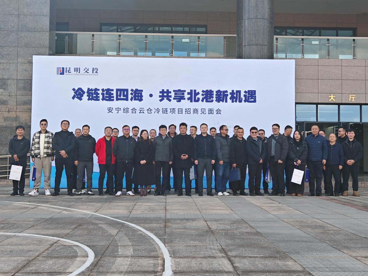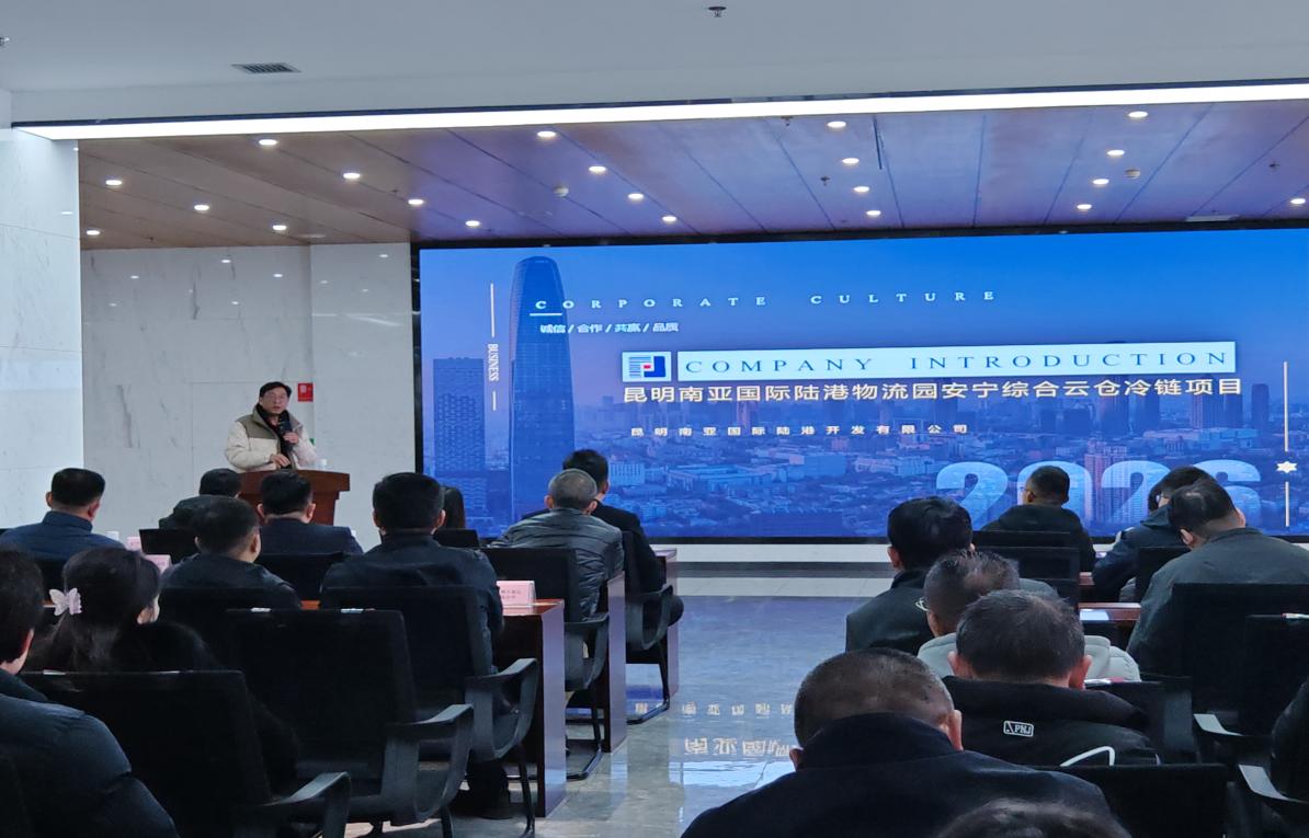 2026年新年收假的第一个周末,历经近一个月的精心组织、策划,在昆明港通物流集团的全程指导与支持下,1月11日(星期日)下午13:30,公司安宁综合云仓冷链项目招商见面会在公司综合信息大楼一楼大厅隆重举行。安宁市人民政府连然街道办事处、安宁市人民政府金方街道办事处、昆明国际陆港安宁北港发展中心等政府有关主管部门,云南省冷链物流行业协会、云南省物流与供应链联合会、昆明市供应链协会、云南省冷冻食品行业协会,昆明市盘龙区农村信用合作联社白龙信用社、华夏银行股份有限公司昆明红塔支行,以及云南顺丰速运有限公司、云南邮政物流服务有限公司等20余家冷链客户受邀出席活动。昆明港通物流集团总经理吕鹏飞、副总经理刘也维、财务总监尹冬容出席,南亚陆港领导班子及中层全员参加本次活动,南亚陆港公司副总经理刘成主持活动。