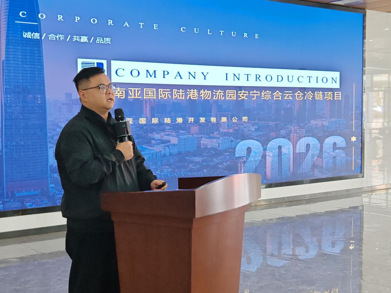 南亚陆港董事长刘恒宇同志从公司简介、园区物流基础设施配套、交通区位优势、物流组织服务能力,以及安宁综合云仓冷链项目两座仓库功能布局、温区控制、各项技术参数等方面项目进行了系统推介。同时表示南亚陆港公司期待与各位企业家、各位同行积极探讨、交流、洽谈,争取挖掘更多合作点、促成前期洽谈签约落地,携手并肩、共享北港新机遇。